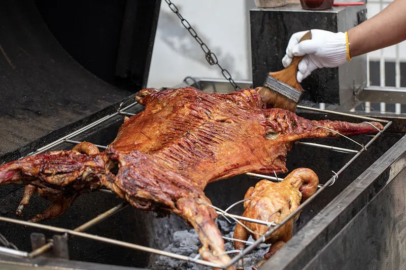 烤全羊是新疆最名贵的菜肴之一,它可与北京烤鸭、广州脆皮乳猪 相媲美。高级筵席中,如果有烤全羊餐车出现在宾客们中间,整台筵席将顿时生辉,显得格 外豪华阔绰,为饮宴增添了异常丰富的色彩。烤全羊所以如此驰名,除了它选料考究外,就 是它的别具特色的制法。新疆羊肉质地鲜嫩无膻味,在国际国内肉食市场上享有有盛誉。烤 全羊色泽黄亮,皮脆肉嫩,鲜香异常 。