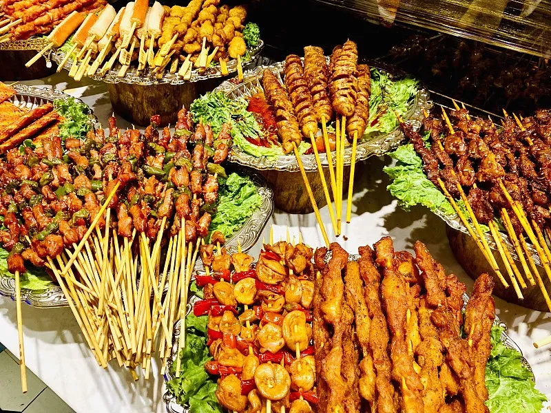 正宗新疆羊肉串,肉又香又嫩. 这里圣传一句话,新疆的羊走的是黄 金大道,吃的是天然中草药,喝的是天山雪水,也就是矿泉水,肉能不香嘛~新疆的羊全身都是宝。