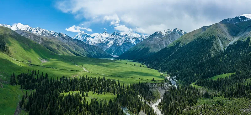 山脉与盆地相间排列盆地与高山环抱、喻称“三山夹二盆”。北部阿尔泰山,